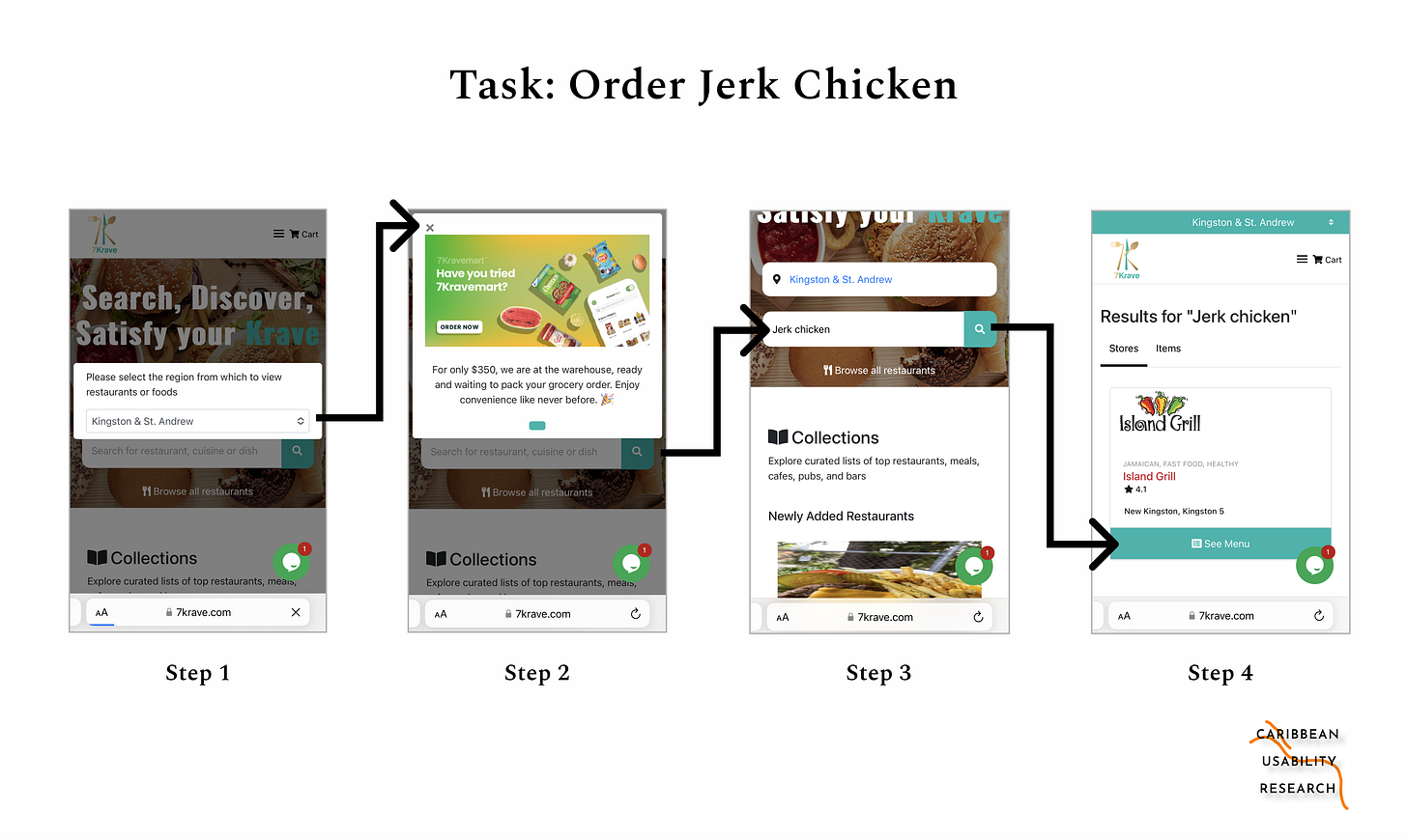 7Krave™ is a Jamaican food service based in Kingston, Jamaica. In the example below we look at a portion of a user flow for the specific task of ordering jerk chicken online.