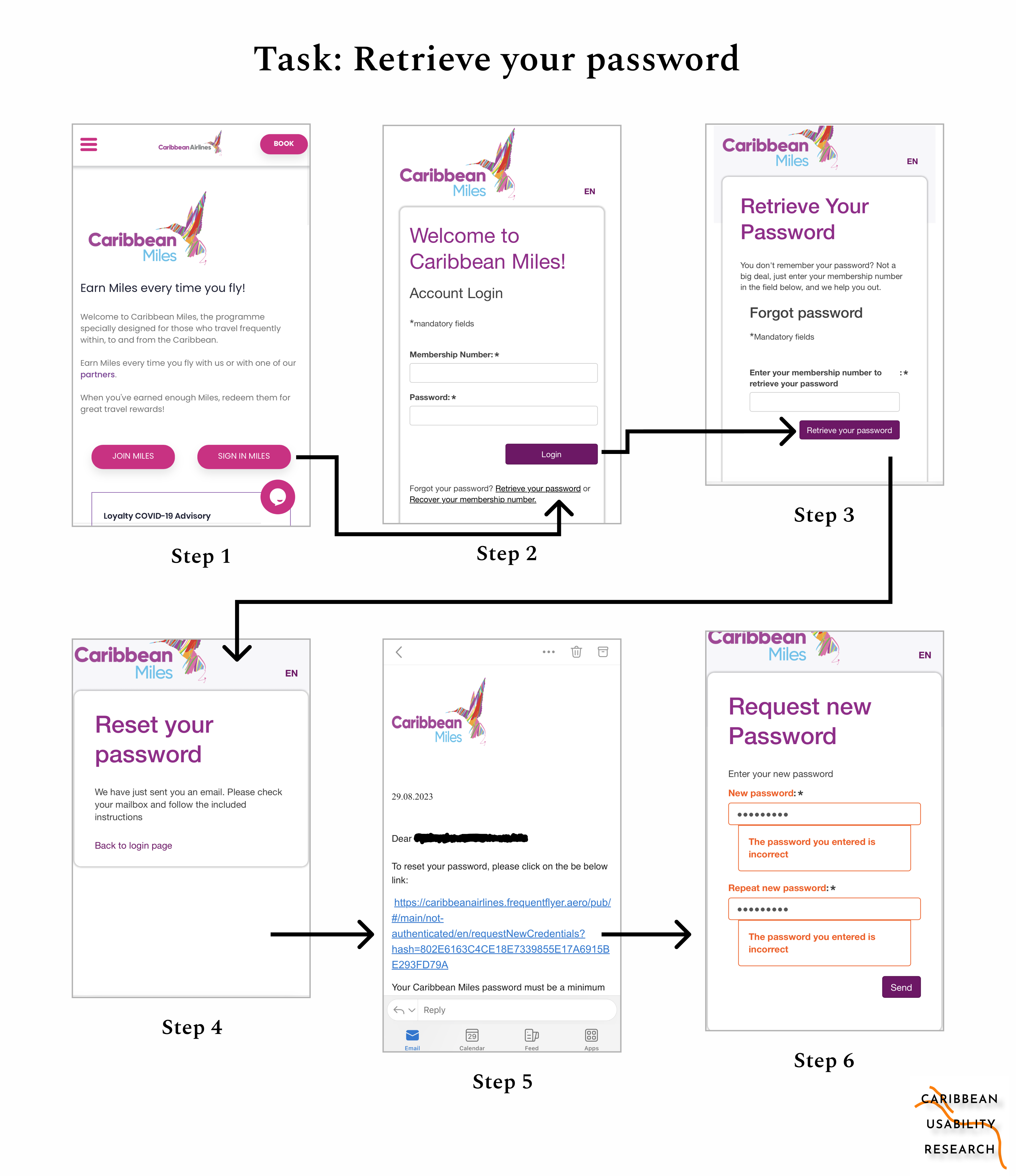 In step 6, Tracey has entered a password with exclamation points (which you cannot tell by the image). But when she clicks ‘SEND’, the only message she gets is that “the password you entered is incorrect.” Stacey has no idea why her password is incorrect because Caribbean Airlines has not told her. She has to figure out, on her own, what the issue is. She might make a lucky guess and try something without an exclamation mark and be successful, or she can spend more time than she’d like figuring out the issue by trial and error.